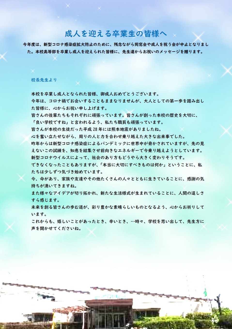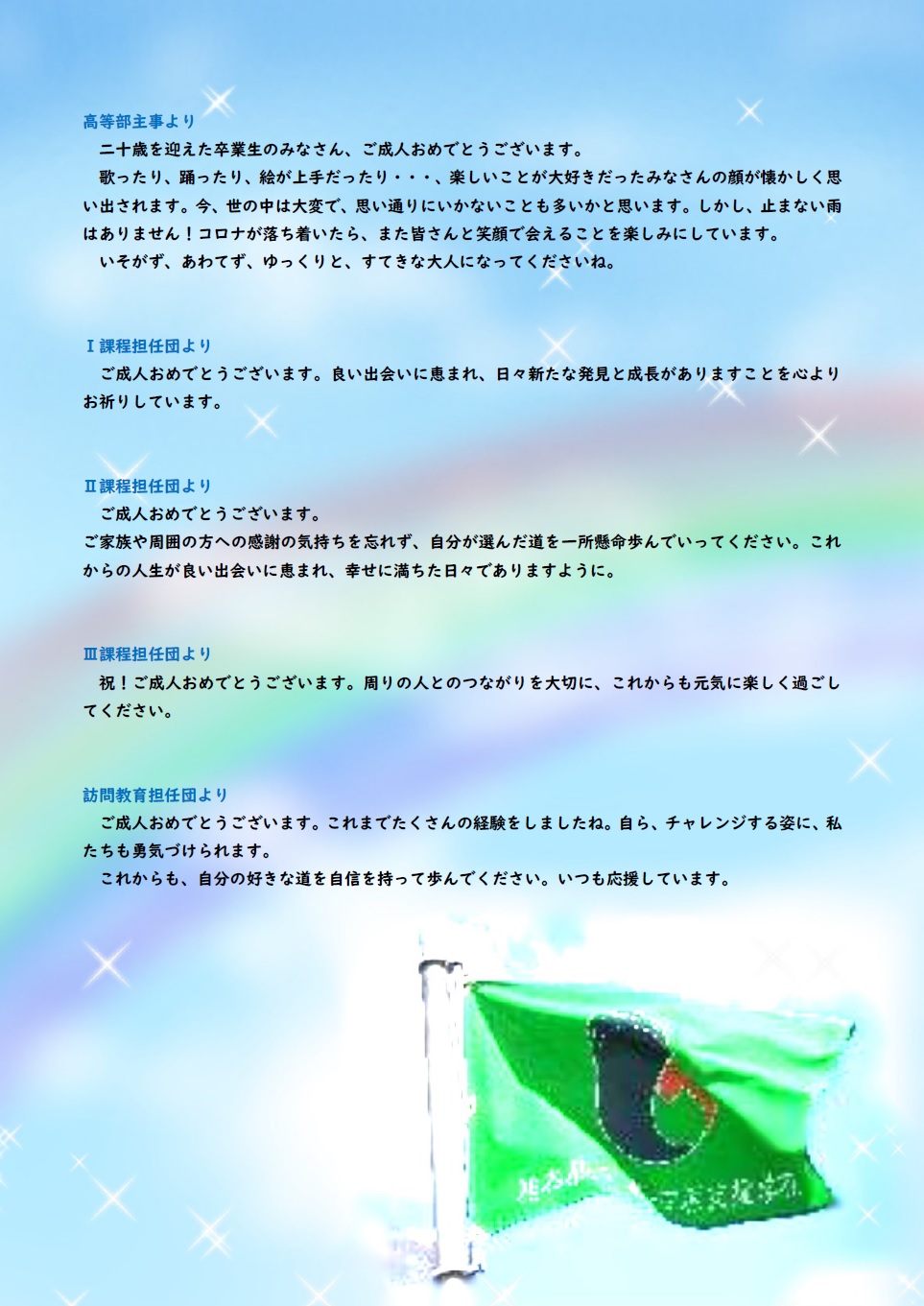 学校概要 学校長より 学校沿革 学校経営改革方針 生徒の状況 校歌 校章 学校生活 学校行事 施設紹介 教育課程 制服 学科説明 進路状況 部活動 部活動紹介 庶務連絡 事務室 図書館 保健室 アクセス 地図 受検生の方へ 入学者選抜 学校見学会 夏季 学校説明会